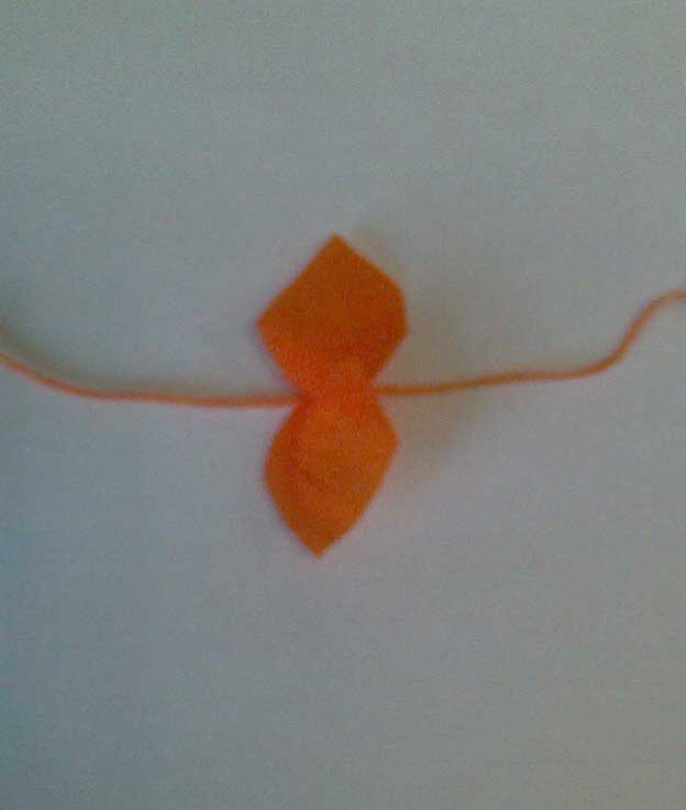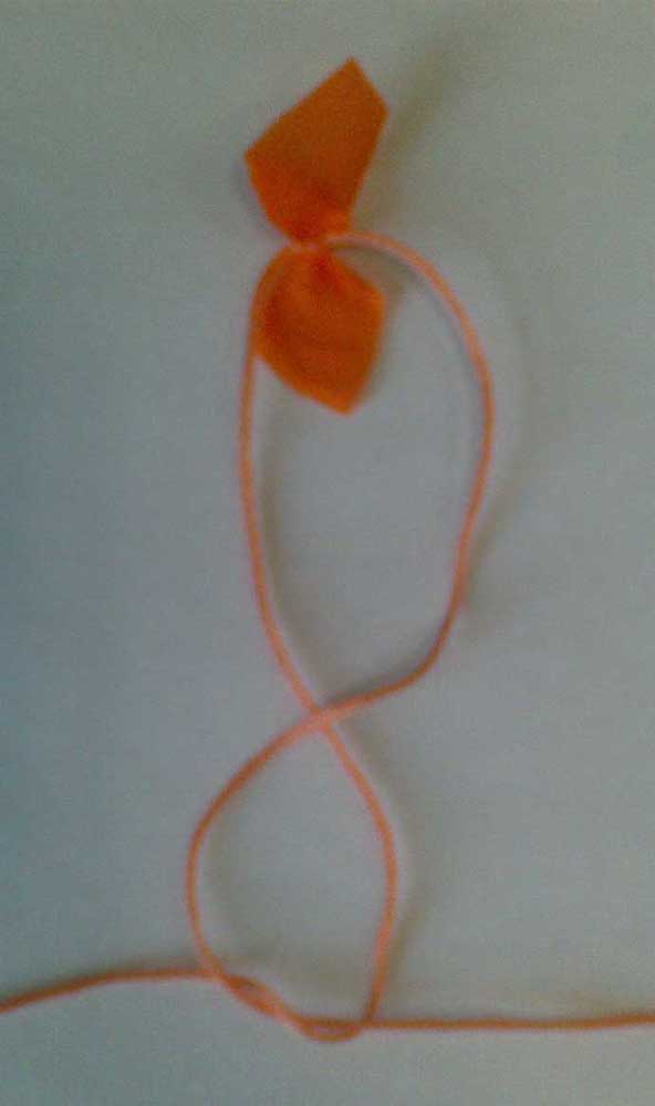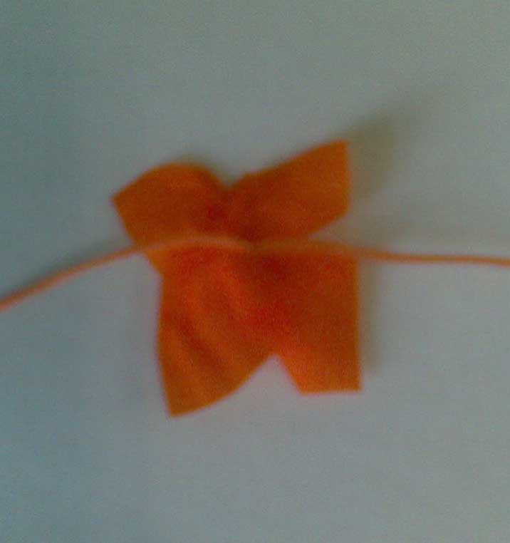 2 этап - взять нитку прочную (мулине) и обвязать первый лепесточек двумя узлами накрест.